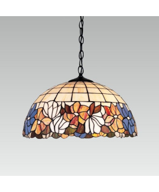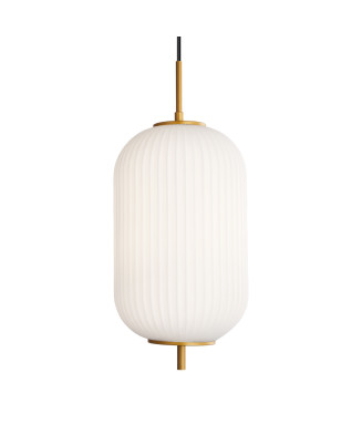 Biely lakovaný kovový rám. Difúzor z bieleho fúkaného skla. Oceľové lanká s nastaviteľnou dĺžkou a automatickými zarážkami.